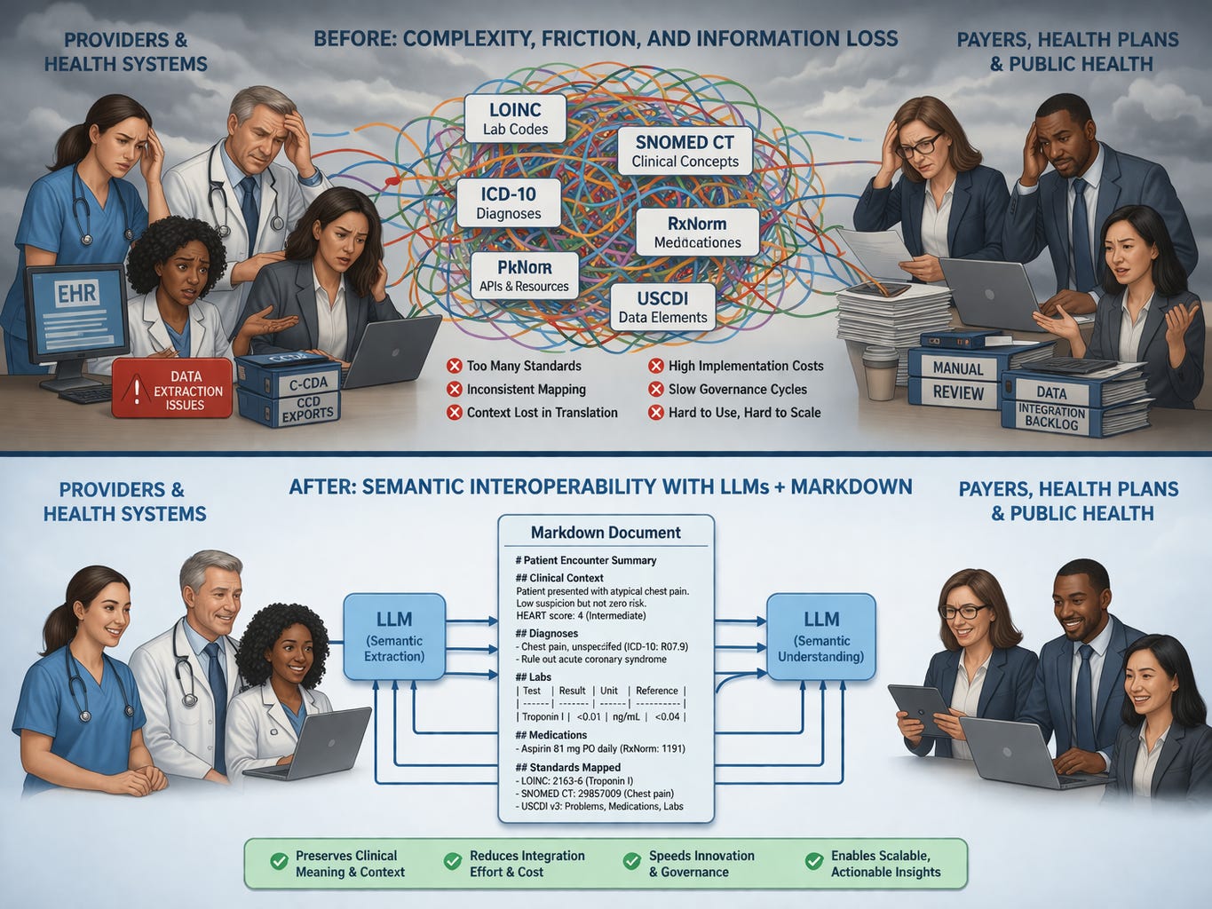 That is a meaningful contrast with the current healthcare interoperability model. XML schemas, HL7 segments, FHIR resource definitions — these require a parser that has been explicitly programmed to expect a specific structure at a specific location. If the structure deviates, the parser fails or silently drops data. A language model reading markdown does not fail when a field is missing or phrased differently. It interprets what is there and works with it.
